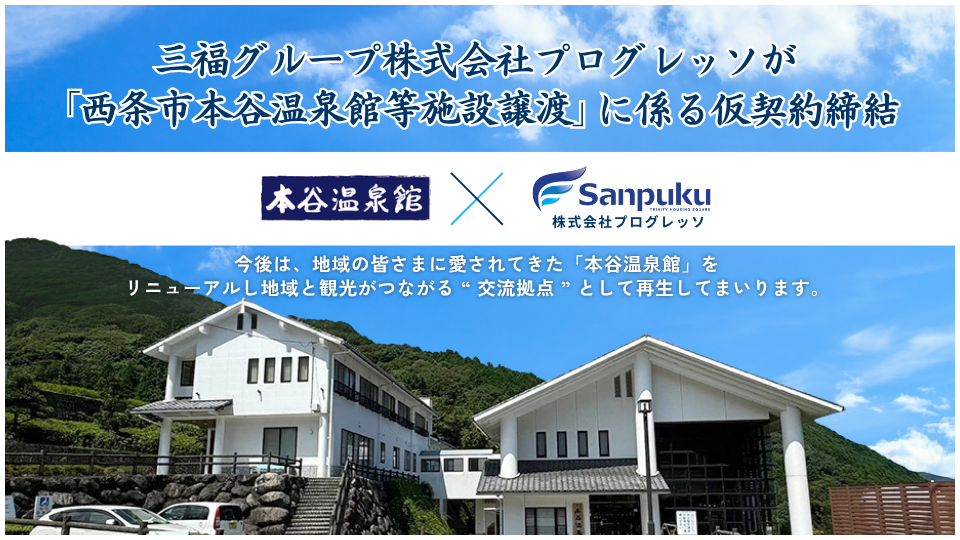 三福グループの株式会社プログレッソは、「西条市本谷温泉館等施設譲渡」に係るプロポーザルの協議を進め、2025年10月1日に西条市と市有財産売買の仮契約を締結しました。