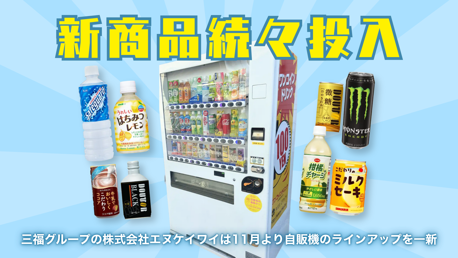 三福グループの株式会社エヌケイワイでは、11月より自販機のラインアップを順次リニューアルいたします。