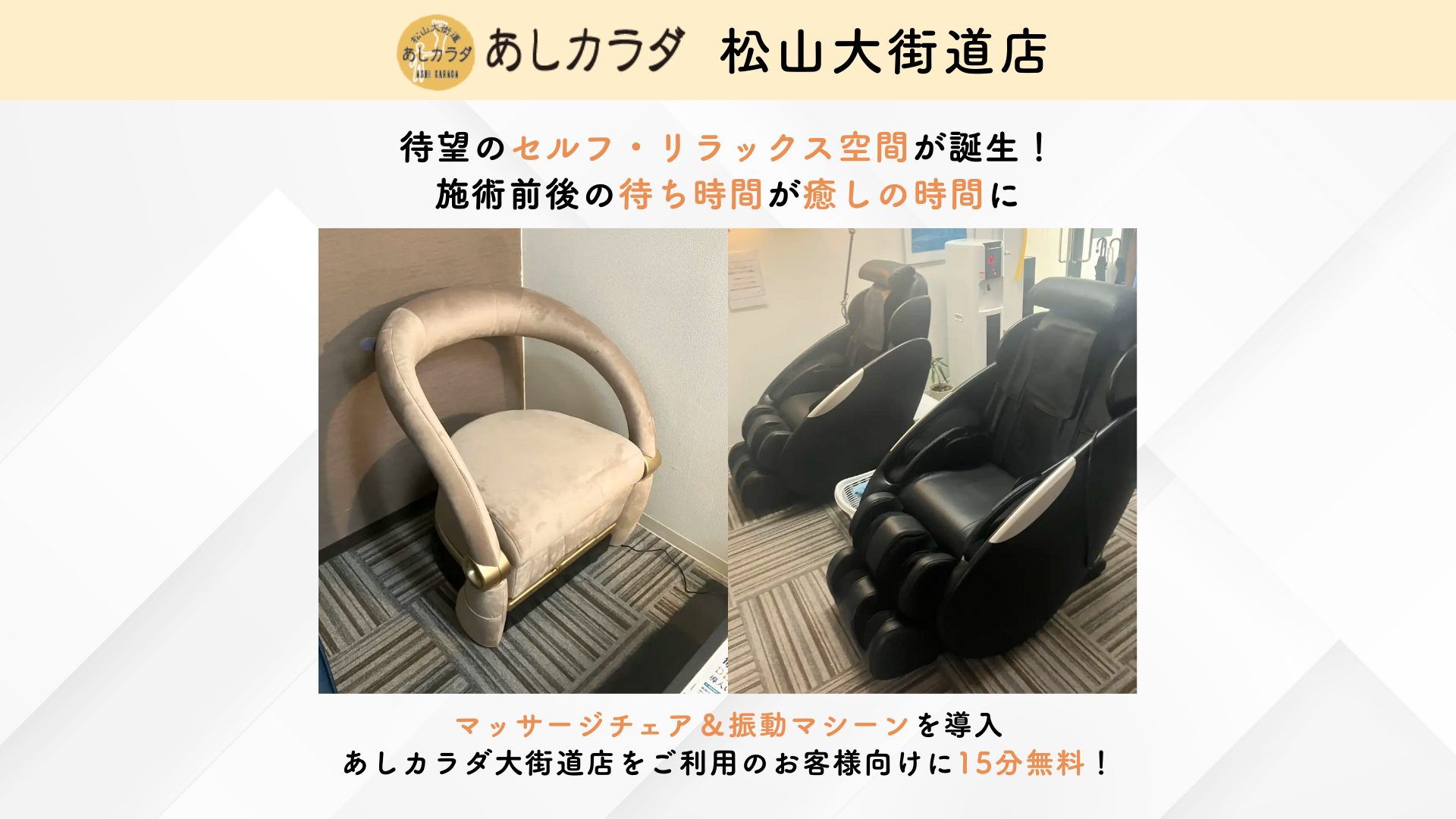 松山・大街道エリアに待望の「セルフ・リラックス空間」が誕生!マッサージチェア&振動マシーンを無料導入