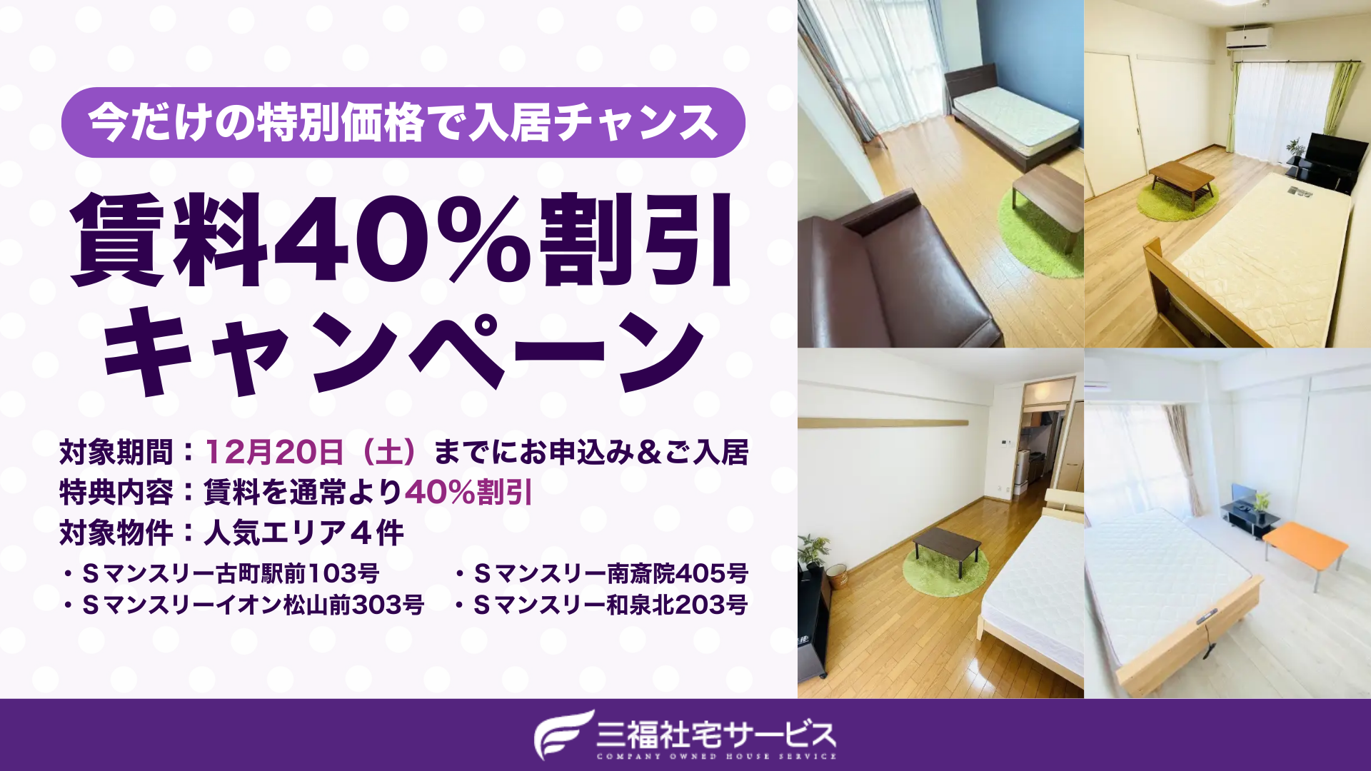 三福社宅サービスでは、家具・家電付きマンスリーマンション賃料40%割引の冬キャンペーンを実施中です。