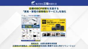 三福快適生活では、企業のBCP(事業継続計画)を支援する「家具・家電の即時導入サービス」を強化しています。