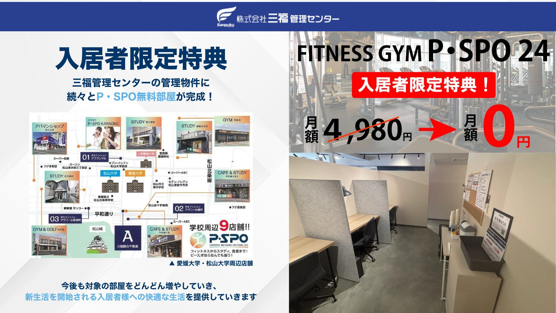 三福管理センターの管理物件で、入居当日からフィットネス&自習室複合施設「P・SPO(ピースポ)」を無料で使えるお部屋の提供を順次拡大しています。
