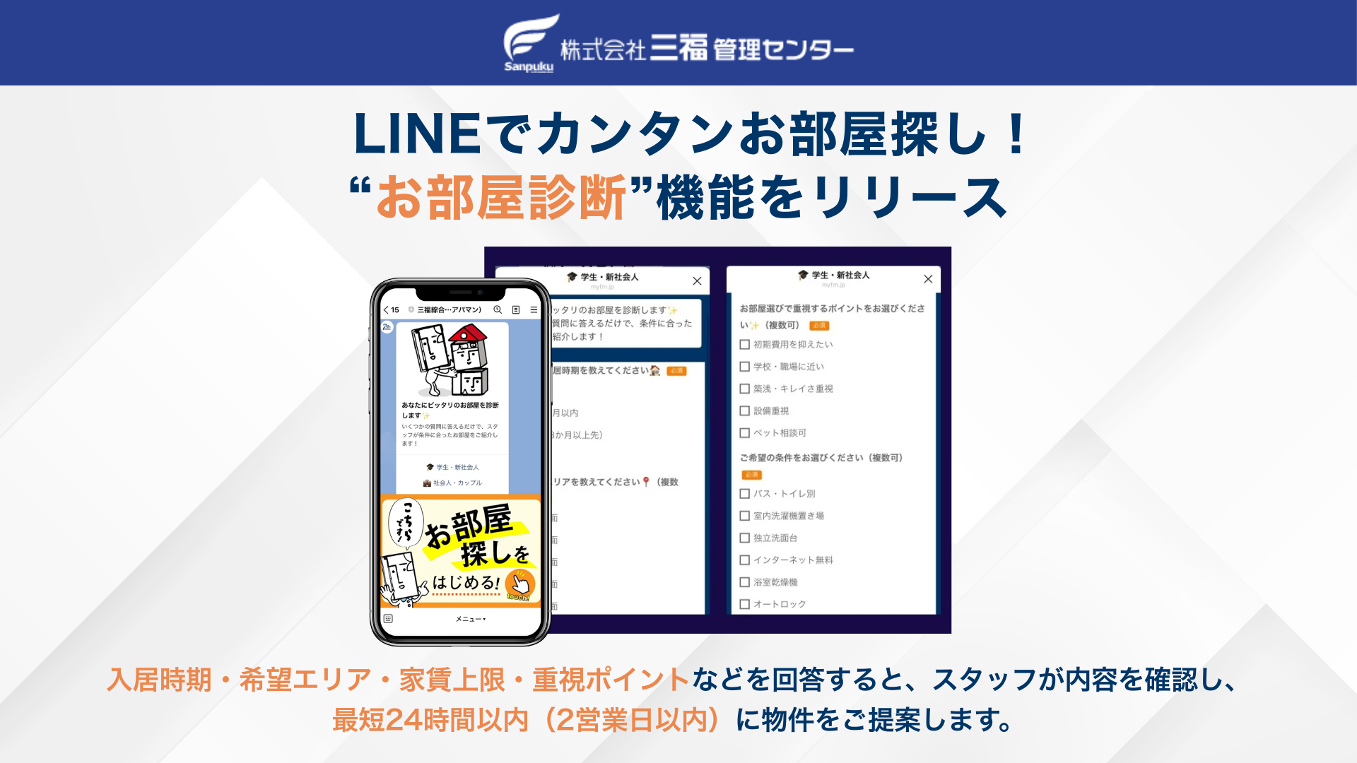 三福綜合不動産は、公式LINEから手軽に相談できる**「お部屋診断」機能をリリースしました。