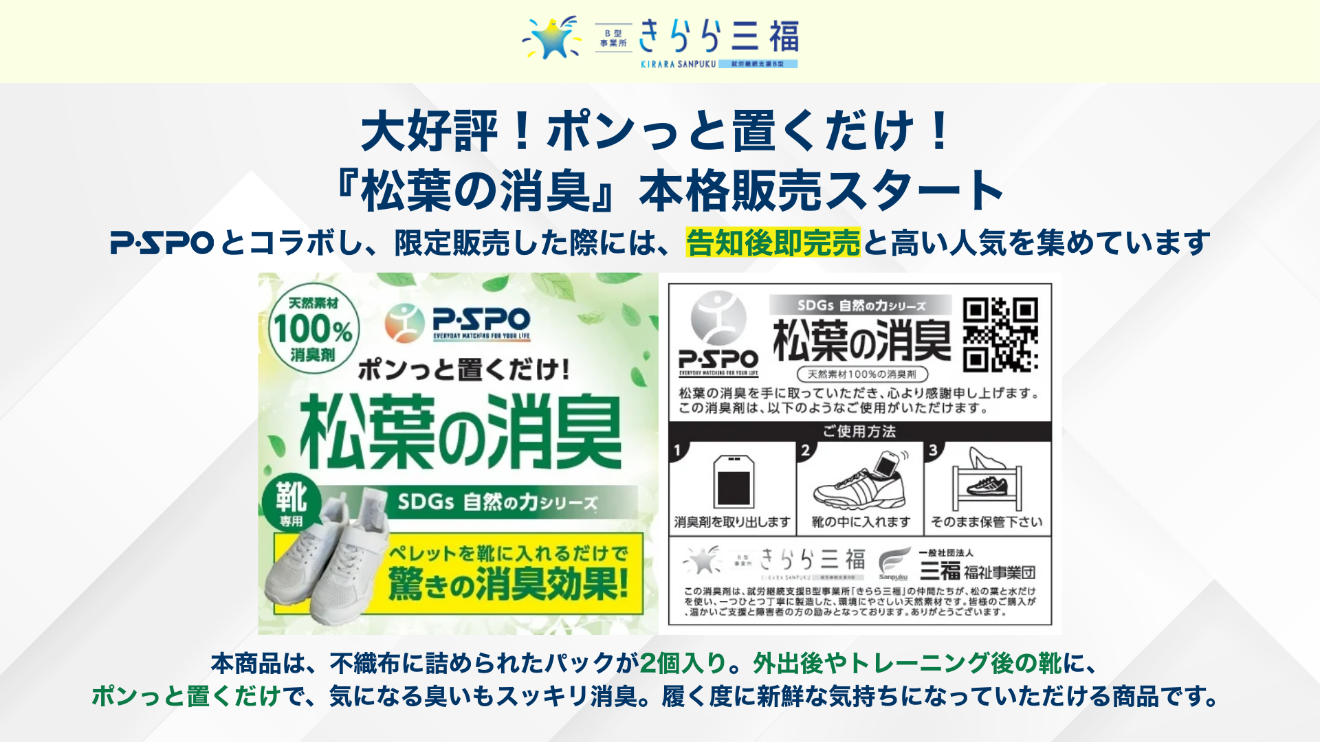 就労継続支援B型事業所「きらら三福」は、松葉ペレットを使った消臭剤『松葉の消臭』の本格販売を開始いたしました。