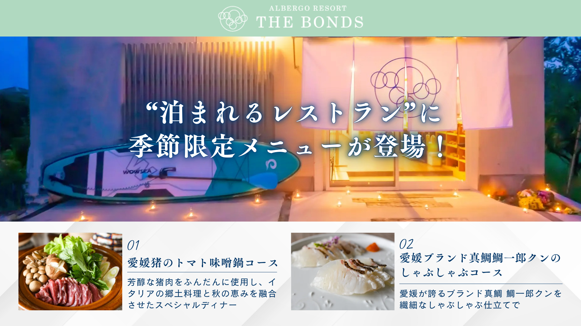 松山市・中島の「ALBERGO RESORT THE BONDS」では、“泊まれるレストラン”ならではの季節限定ディナーをご用意しています。