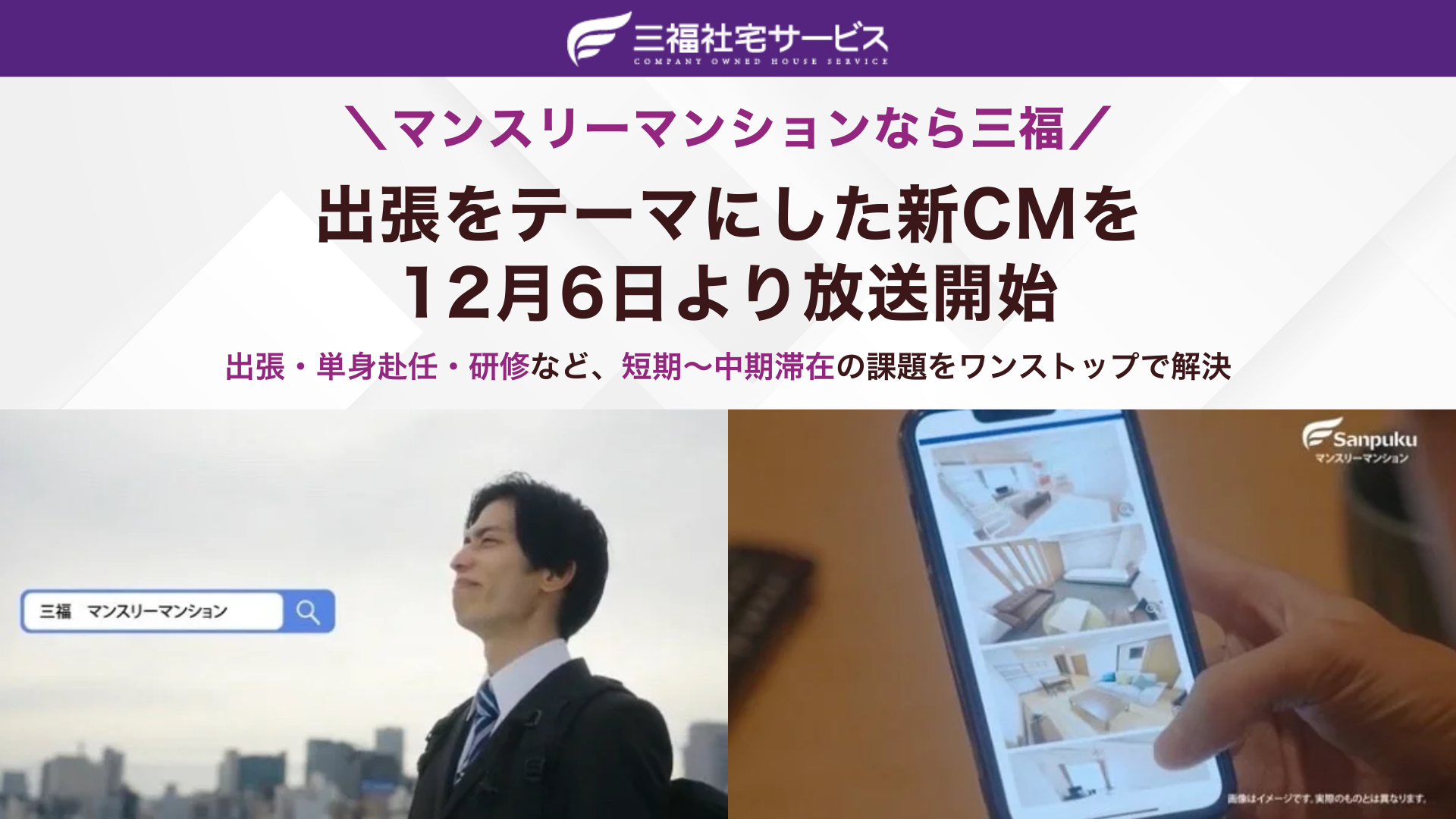三福社宅サービスは、出張・単身赴任・研修などの滞在ニーズに向けた認知拡大のため、テレビCMの放送を開始しました。