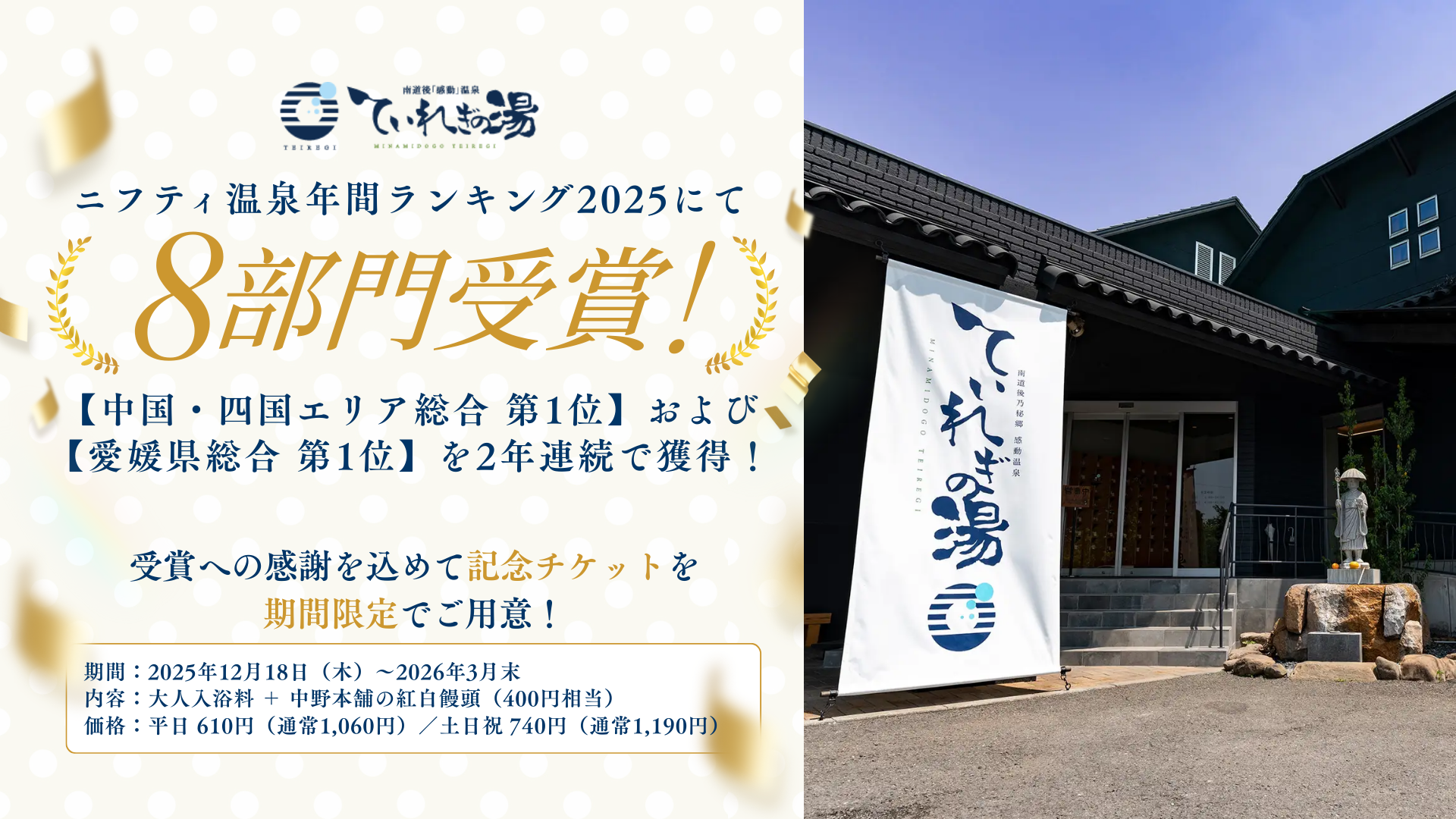 ニフティ温泉 年間ランキング8部門受賞-ていれぎの湯が中四国総合1位を連覇