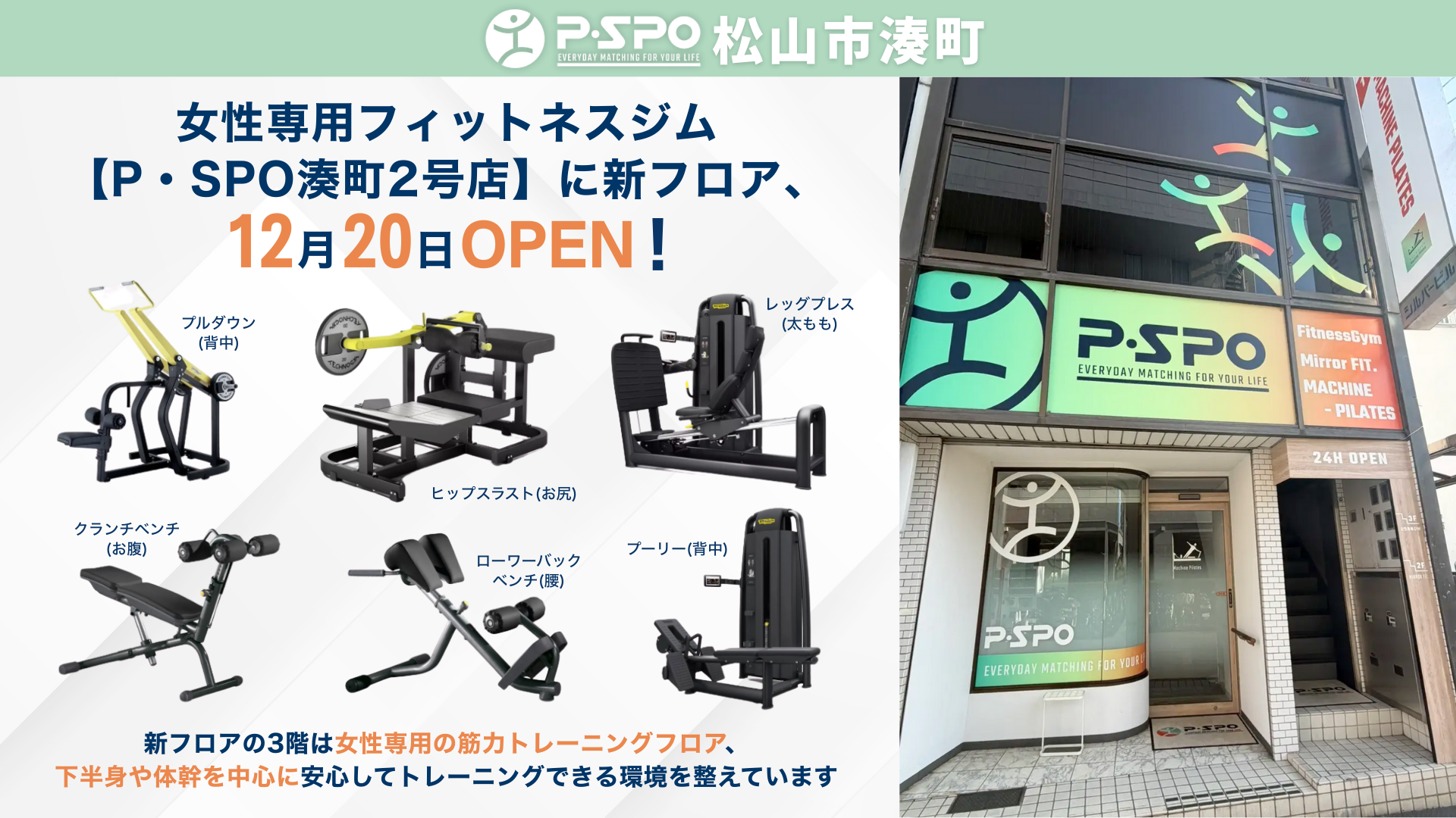 松山市湊町の「P・SPO湊町2号店」3階に、女性専用フィットネスジムが12月20日(土)オープンします。