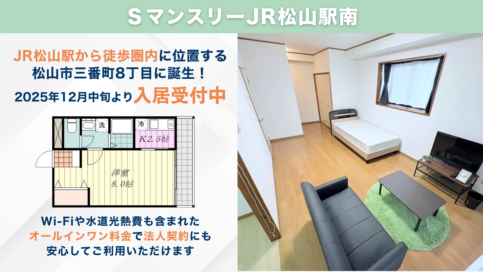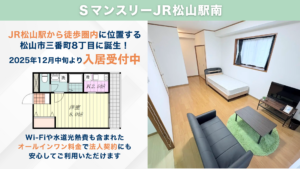JR松山駅から徒歩圏内に、家具・家電付きのマンスリーマンション「SマンスリーJR松山駅南」が誕生しました。