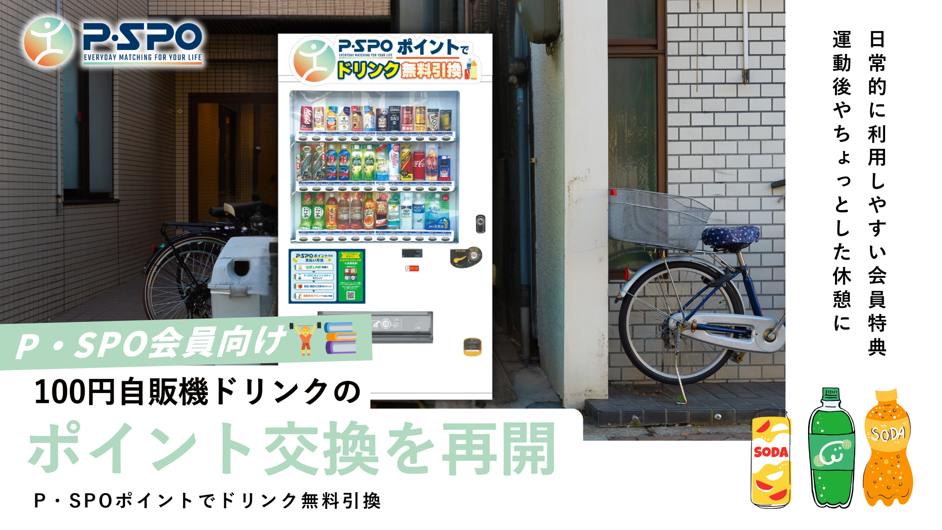P・SPOは、会員特典の「100円自販機ドリンク」ポイント交換を再開いたしました。