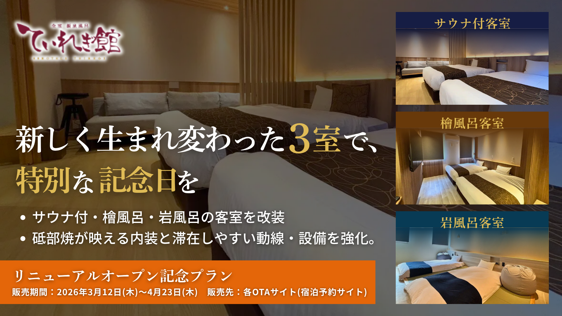 南道後温泉ホテルていれぎ館では人気の3室(サウナ付客室・檜風呂客室・岩風呂客室)の内装およびレイアウトを刷新し、リニューアルオープンしました。