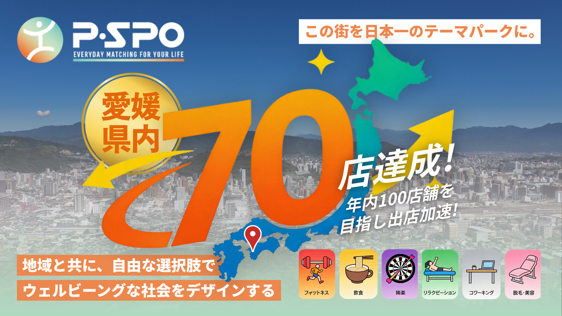 「P・SPO(ピースポ)」は愛媛県内での展開店舗数が70店舗規模に到達し、今後は年内100店舗を目標に出店を加速してまいります。