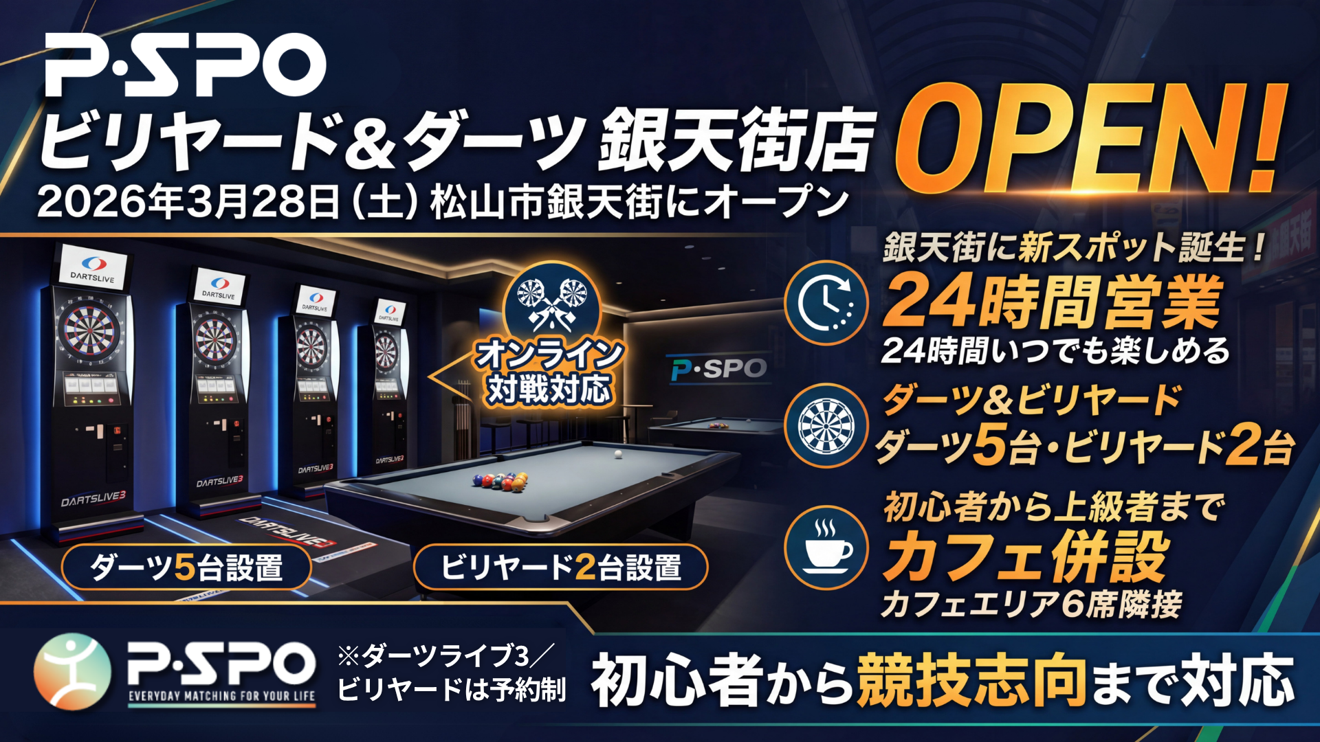 「P・SPO」は、2026年3月28日、松山市銀天街に「P・SPO ビリヤード&ダーツ銀天街店」をオープンしました。