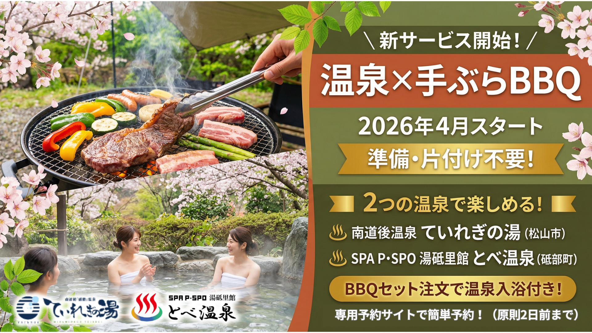 南道後温泉ていれぎの湯とSPA P・SPO 湯砥里館 とべ温泉では、2026年4月より、両施設の敷地内で楽しめる「温泉×手ぶらBBQ」をスタートしました。