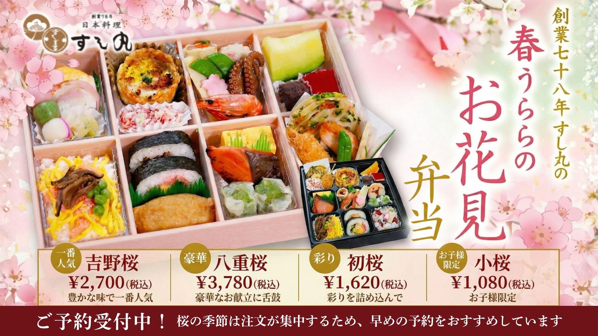 すし丸では春の行楽シーズンに合わせて季節限定の「春うらら お花見弁当」の販売を開始しました。