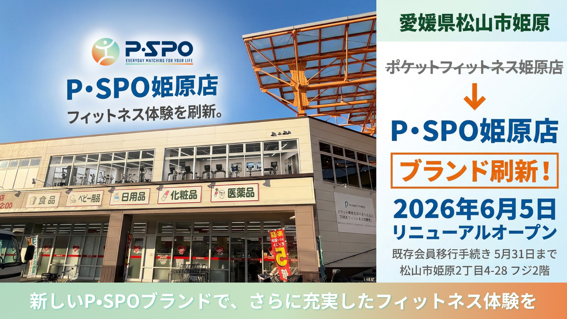 P・SPOは松山市姫原のフィットネス施設「ポケットフィットネス姫原店」をリニューアルし、2026年6月5日より「P・SPO姫原店」として新たにオープンいたします。